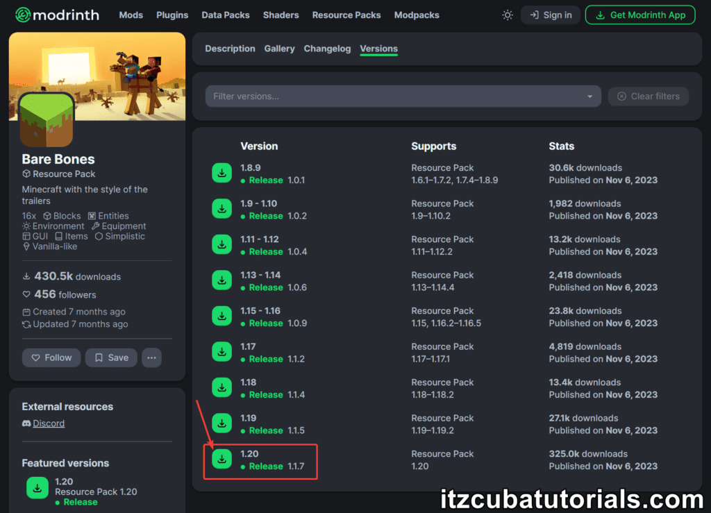 Within the versions tab in Modrinth, we are going to choose the desired version of the pack. In this guide, I will be using the 1.20 which is compatible with Minecraft’s newer version 1.20.6.