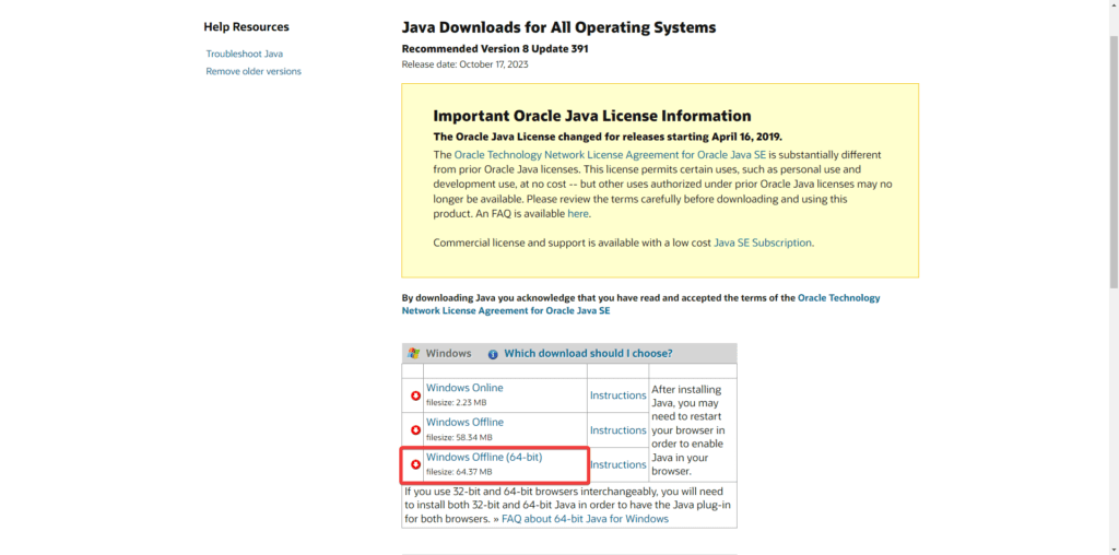 Once you are in the Java website, go ahead and click the version of Java that suits you, in this case, we are downloading the 64-bit option and the offline edition.