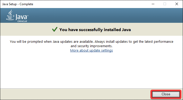 Now that Java has successfully installed, you will see the prompt that shows in the image below, click Close.