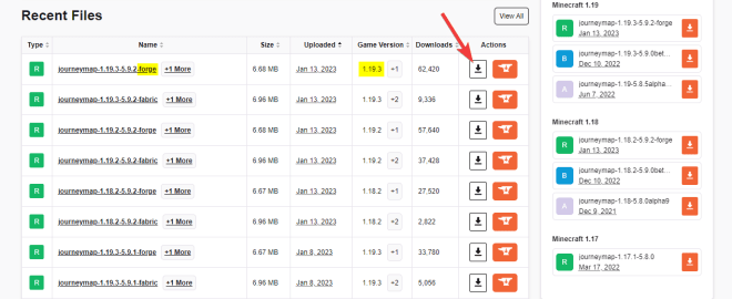 Now select which version or instance of the JourneyMap Mod you want to download. For this tutorial we will be using the Forge instance and the Minecraft 1.19.3 version, which at the moment of making this guide is the newest one, however, feel free to use the version you desire.