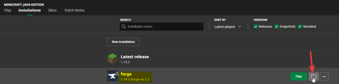 Go ahead and open your Minecraft launcher and select the Installations’ menu right on top in the launcher next to the Play and Skins Menu.