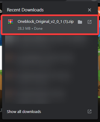 You should be able to find the Oneblock Original zip file within your downloads in your browser. However, if you do not see it in your browser, look for it in your downloads’ folder in your PC.