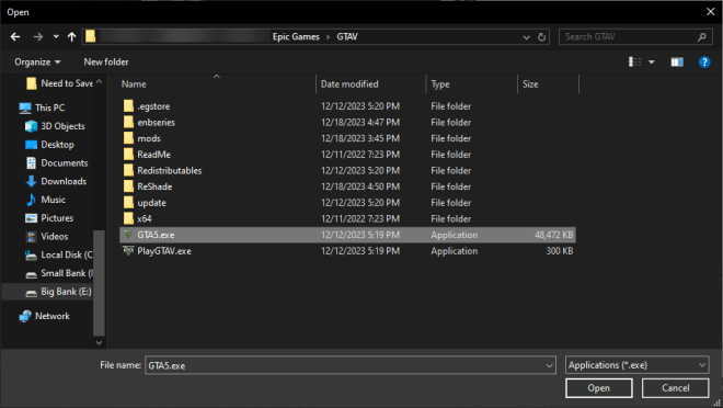 Now find your GTA5.exe file, select it, and click open.