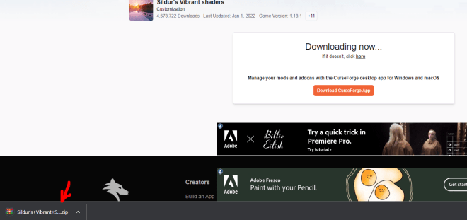 After you click Download this will redirect you to another page where in five seconds the download for the Sildurs Shaders Zip file will begin to download automatically.