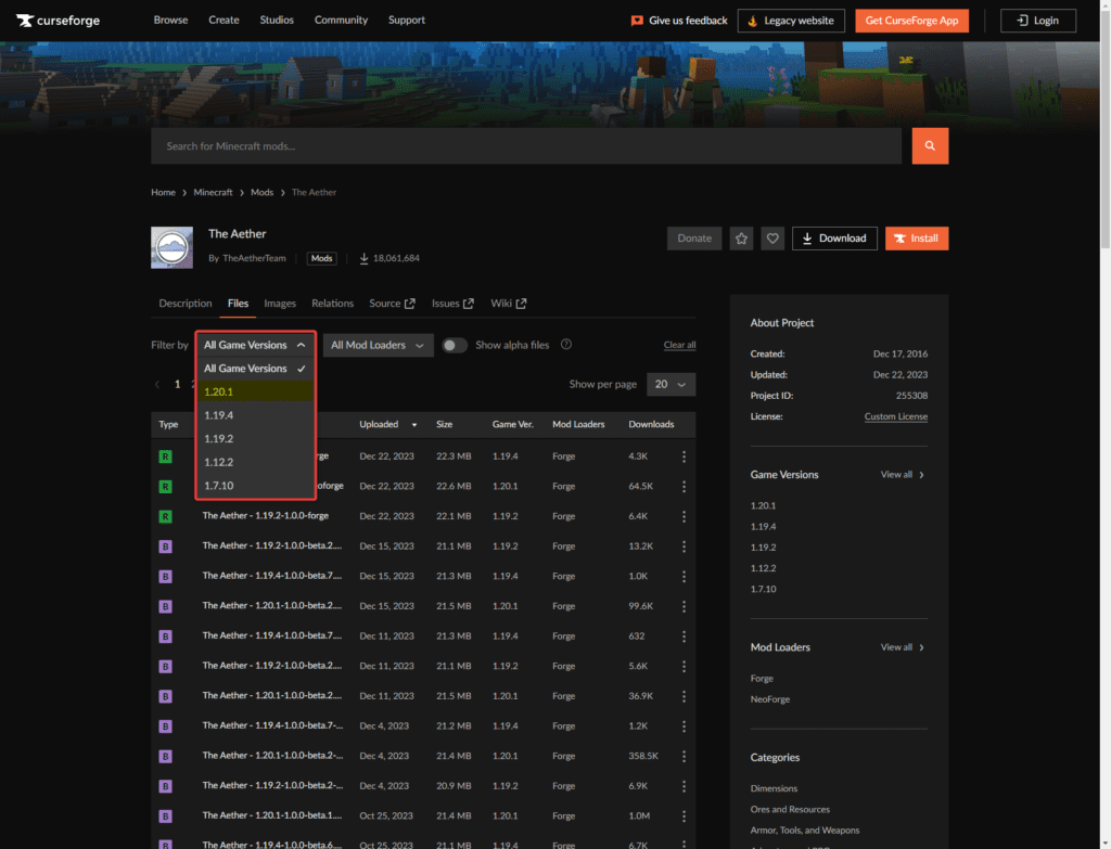 Once you are in the download website, select the version of The Aether that suits you the best. In this guide we are downloading the most recent version, however, you can download the one you need.