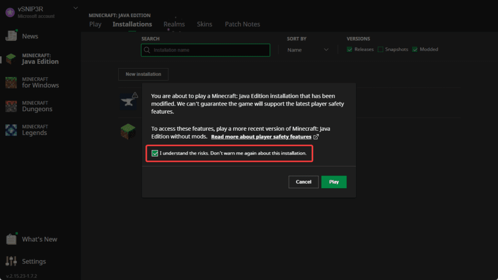 Click that you understand the risk of playing modded Minecraft and click Play.
