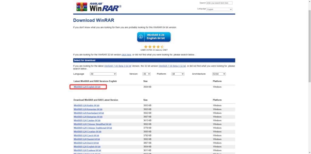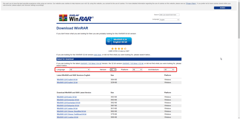 Now we have multiple options to select before we download WinRAR, for example, we can select Language, Version, Platform or Architecture.