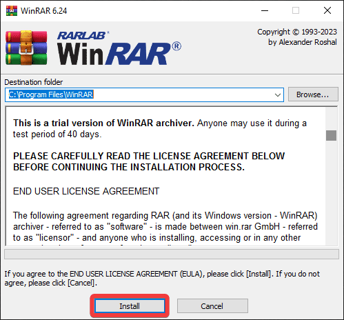 Now Click Install within the WinRAR installation menu, then click OK.