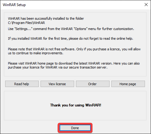 After a couple seconds, WinRAR should be fully installed, and you just need to click “Done”