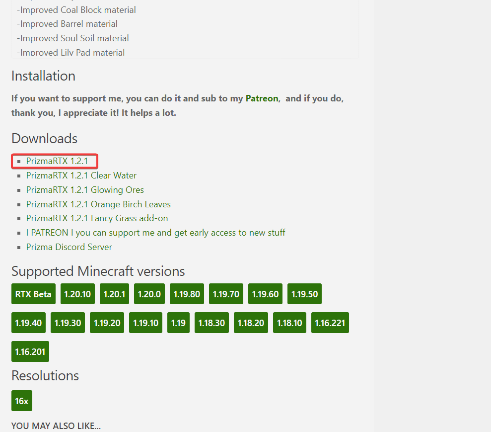 Once in the download website for PrizmaRTX, we are going to scroll down and click the most recent version of the shaders. (See image below for reference)