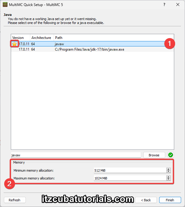 Now, select the Java instance you want to use when playing Minecraft, we recommend Java 21 for anything above 1.20.5, or Java 17 for any Minecraft between 1.16.5 and 1.20.4.