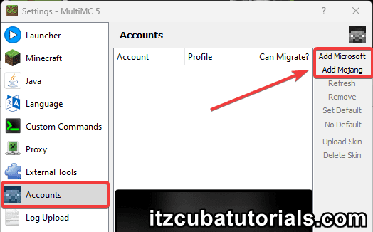 Then, you will add your Minecraft account, you can Add Mojang for older accounts that have not migrated, or you can Add Microsoft for those of you who own Minecraft through Microsoft.