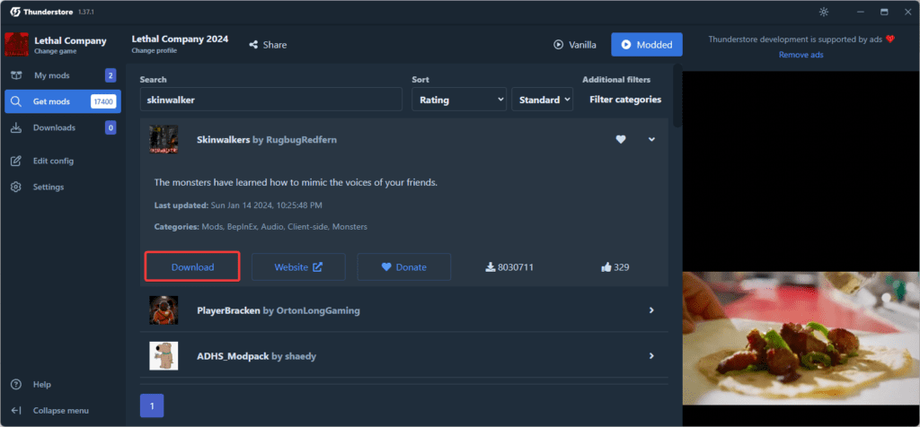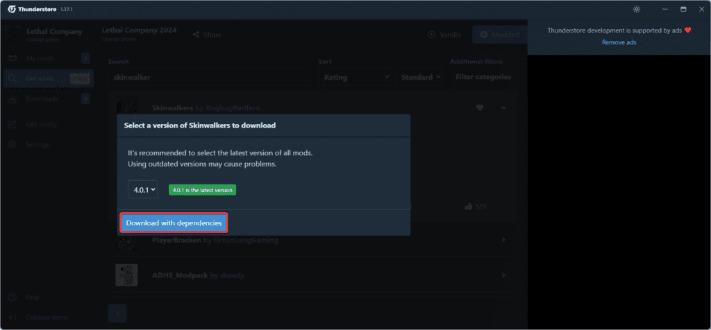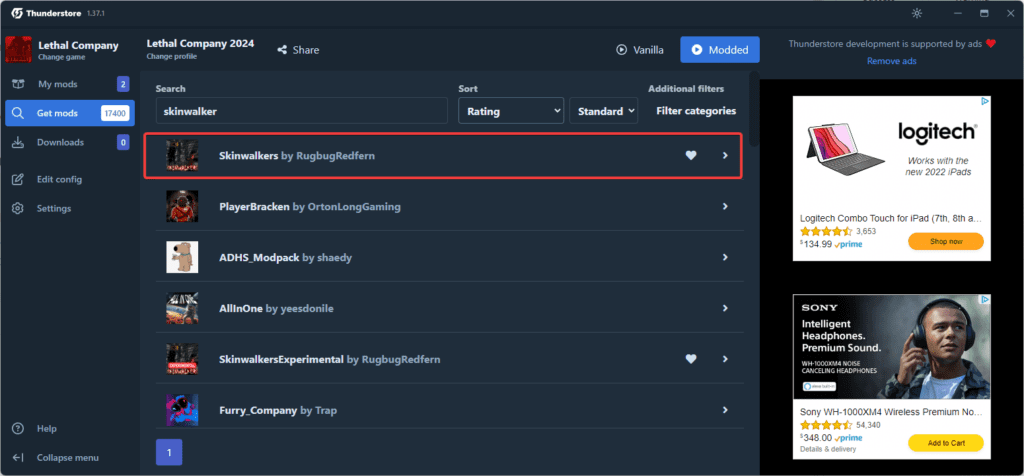 Now, just select Lethal Company and search for the Skinwalkers mod in the get mods button.