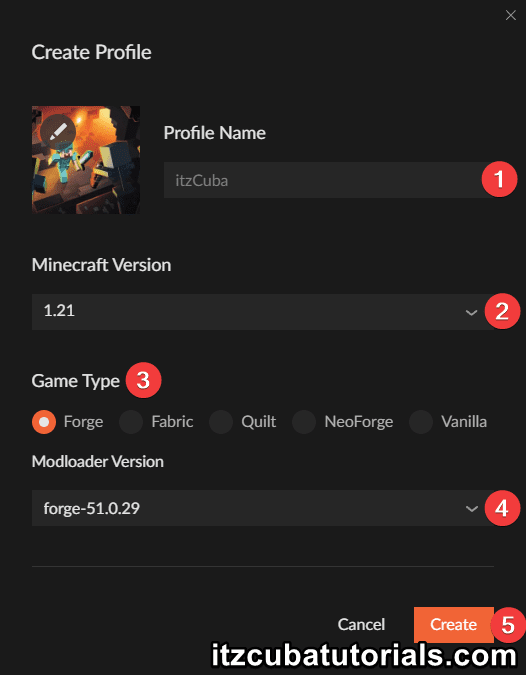 For the next step, fill out all the information required by the Create Profile tab. In here, you will select the version and mod loader you want for your Custom Modpack. Click Create once you finished setting up your Minecraft modpack.