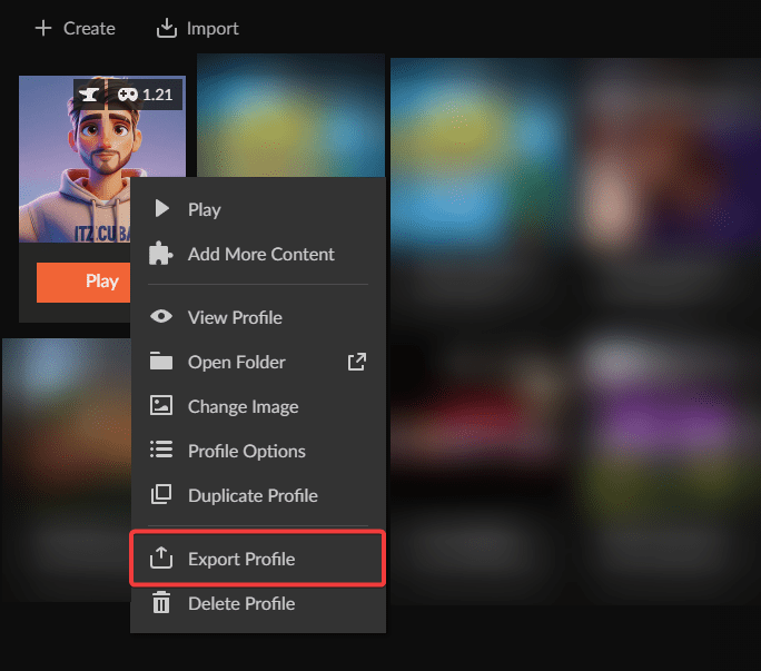 To export a custom Minecraft Modpack in the CurseForge Launcher, right-click the desired modpack and select Export Profile.