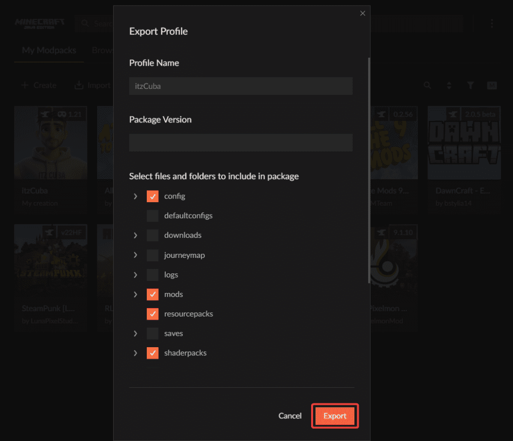 When exporting a custom Minecraft modpack, you are not just limited by mods, there are a lot of other options that could be exported as well.