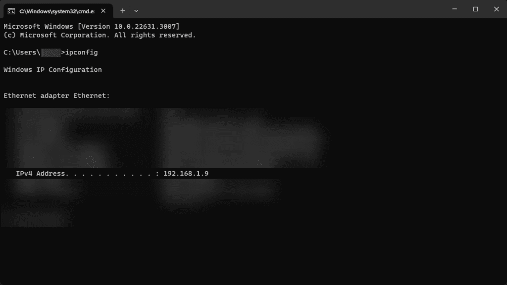 You should now see all the information about your local networth, look for a line called IPv4 Address, copy the numbers at the end, this numbers can be different for everyone in my case it is 192.168.1.9, for you, it could be something similar or completely different.