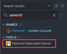 Now click in the search bar and search for an application called Palworld Dedicated Server, once you found it, install it.