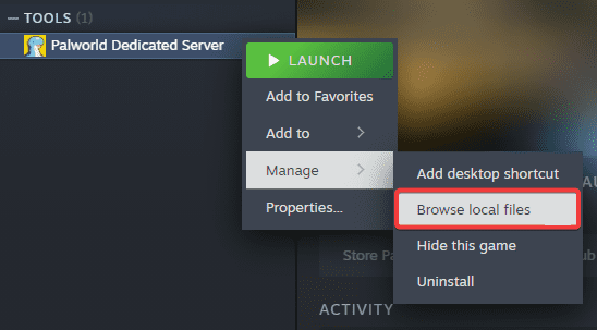 Once the command prompt is closed, right-click the Palworld Dedicated Server tool, hover over Manage, and select Browse local files.