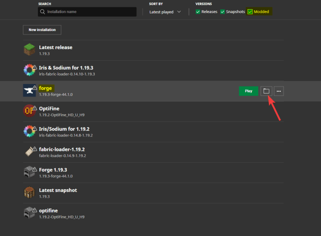 Once in the installations menu go ahead and hover over your Forge installation and click the folder icon highlighted in the image below.